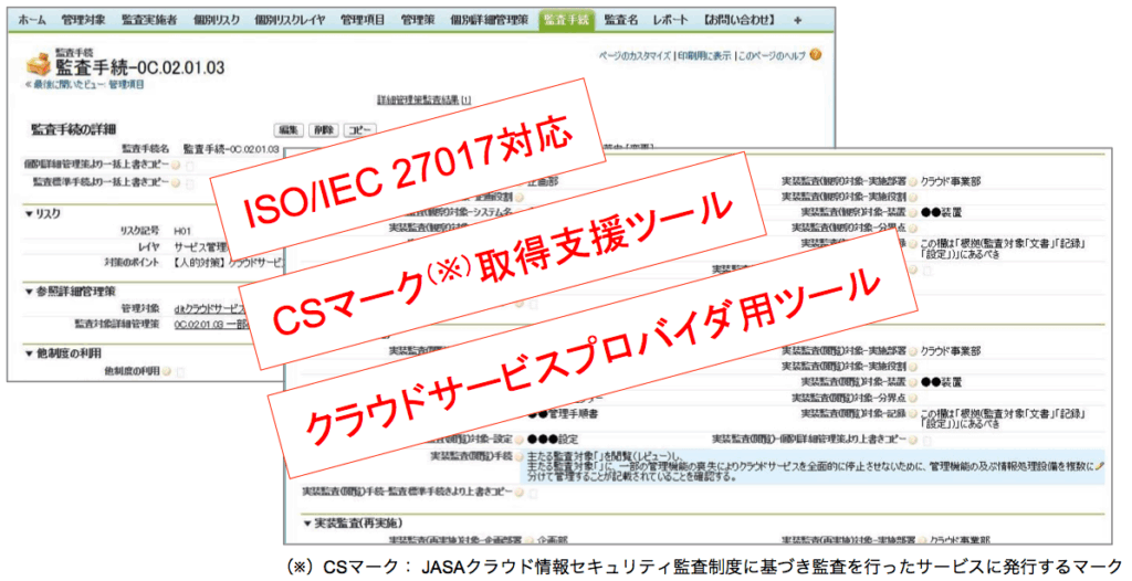 - ベースとなるISO/IEC 27017等規格が改定された際には、監査ツール(JASA-TOOL )のマスターデータベースを更新することで対応し、常に最新の基準で利用できます。
